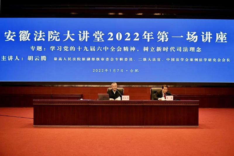 安徽法院网讯 为深入学习贯彻党的十九届六中全会精神,真学真信笃行习近平法治思想,进一步加强全省法院广大干警思想政治建设,1月7日上午,安徽高院启动2022年“安徽法院大讲堂”活动,最高法院原副部级审委会专委、二级大法官、中国法学会案例法学研究会会长胡云腾受邀为全省三级法院干警作新年首场讲座。安徽高院党组书记、院长董开军出席讲座,党组成员、审委会专委袁春主持。