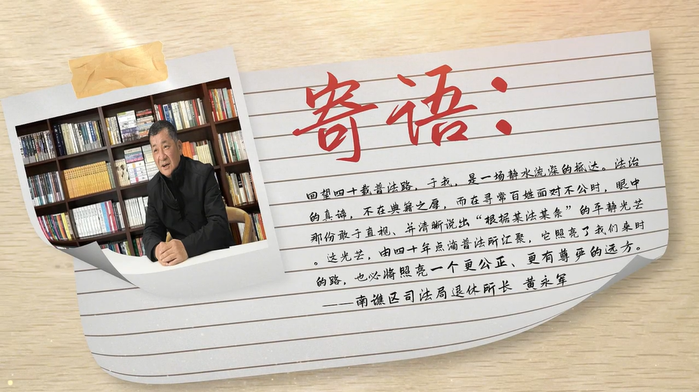 回望四十年普法历程,方式与载体虽不断变迁,我们推动法治深入人心、扎根基层的初心却始终如一。作为这段历史的见证者与实践者,我深感荣幸。